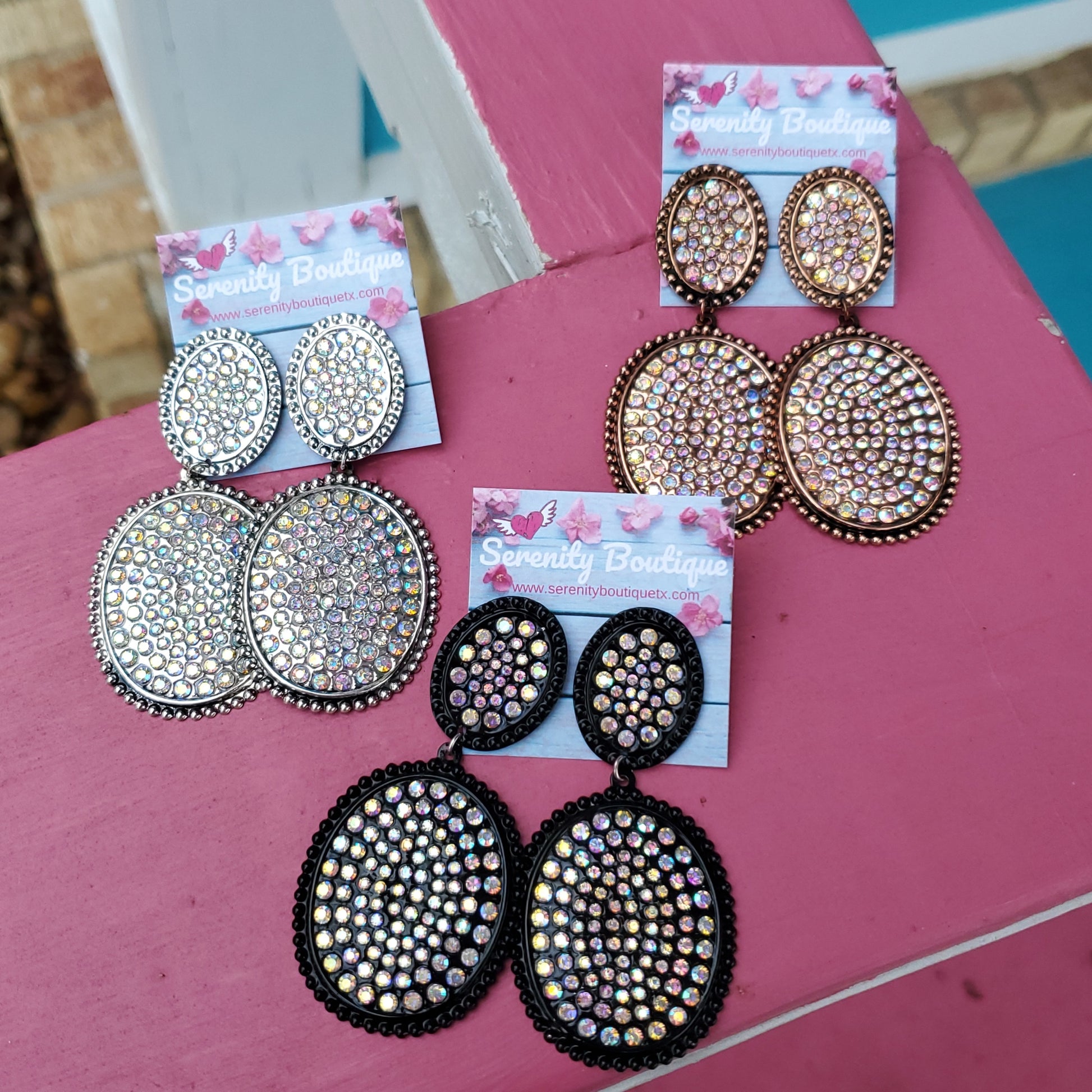 From top of post to bottom of earrings is a 3 inch drop, and 2 inches in width. made of lightweight material so they will not pull one your lobes.