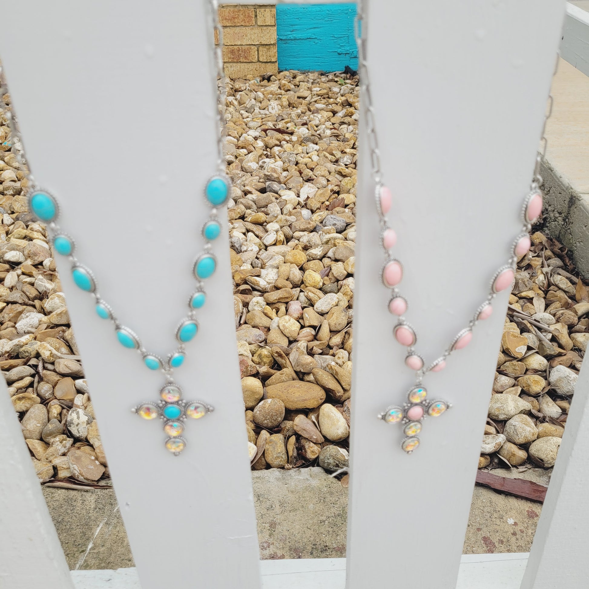 This necklace is the perfect blend of country charm and elegant style. Made with a vibrant turquoise stone and sparkling rhinestones, this cross necklace is perfect for adding a touch of rustic glamour to any outfit. A must-have for any cowgirl fashionista!