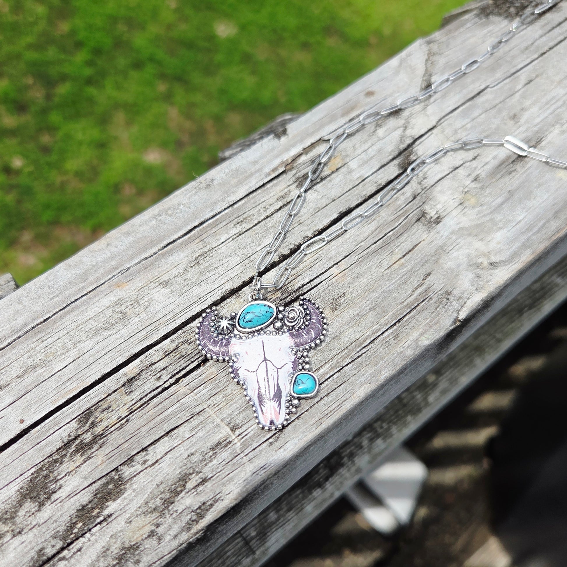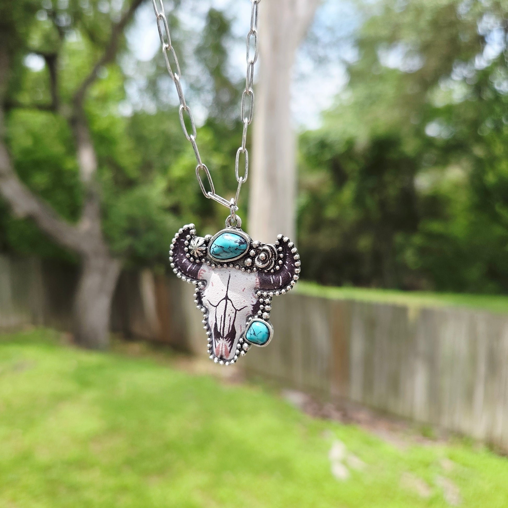 Experience the wild side with the El Toro Necklace. This unique piece features a bull skull pendant with a pop of turquoise. Channel your inner strength and add a touch of edge to any outfit. (No bulls were harmed in the making of this necklace.)