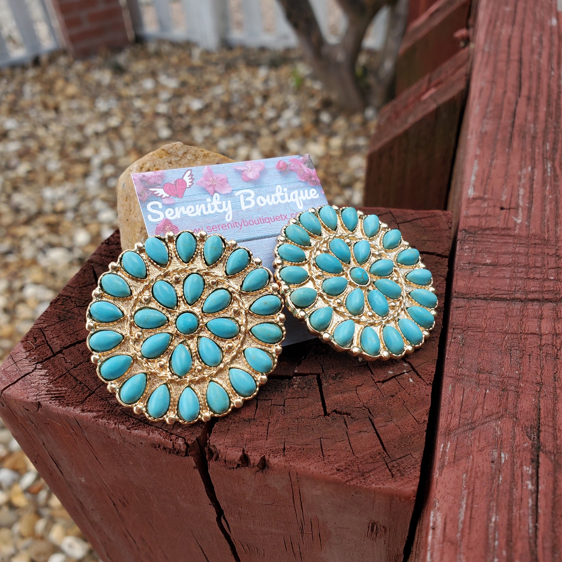 Make a majestic entrance in our Golden Revival Earrings! With these golden conchos and dazzling turquoise stones, these earrings are sure to make a statement and take your look to the next level. Every day is a chance to shine!