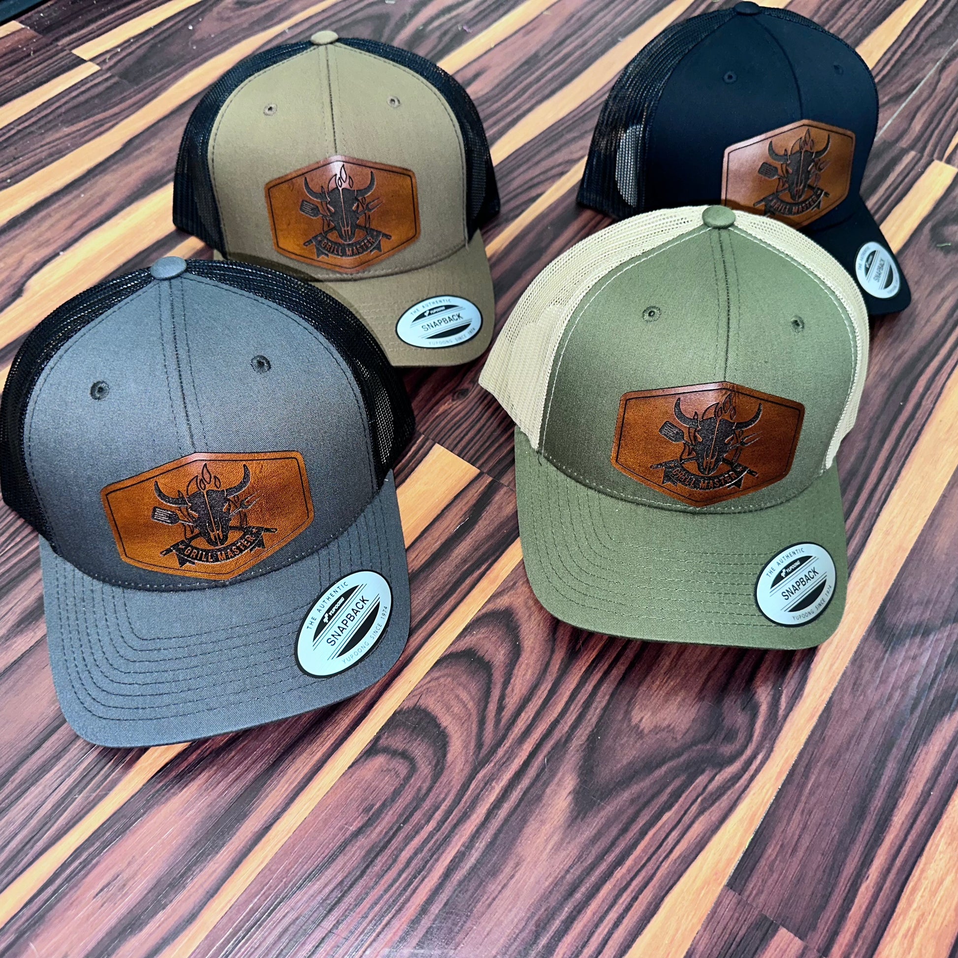 Leather grillmaster patch hat with adjustable closure in back
