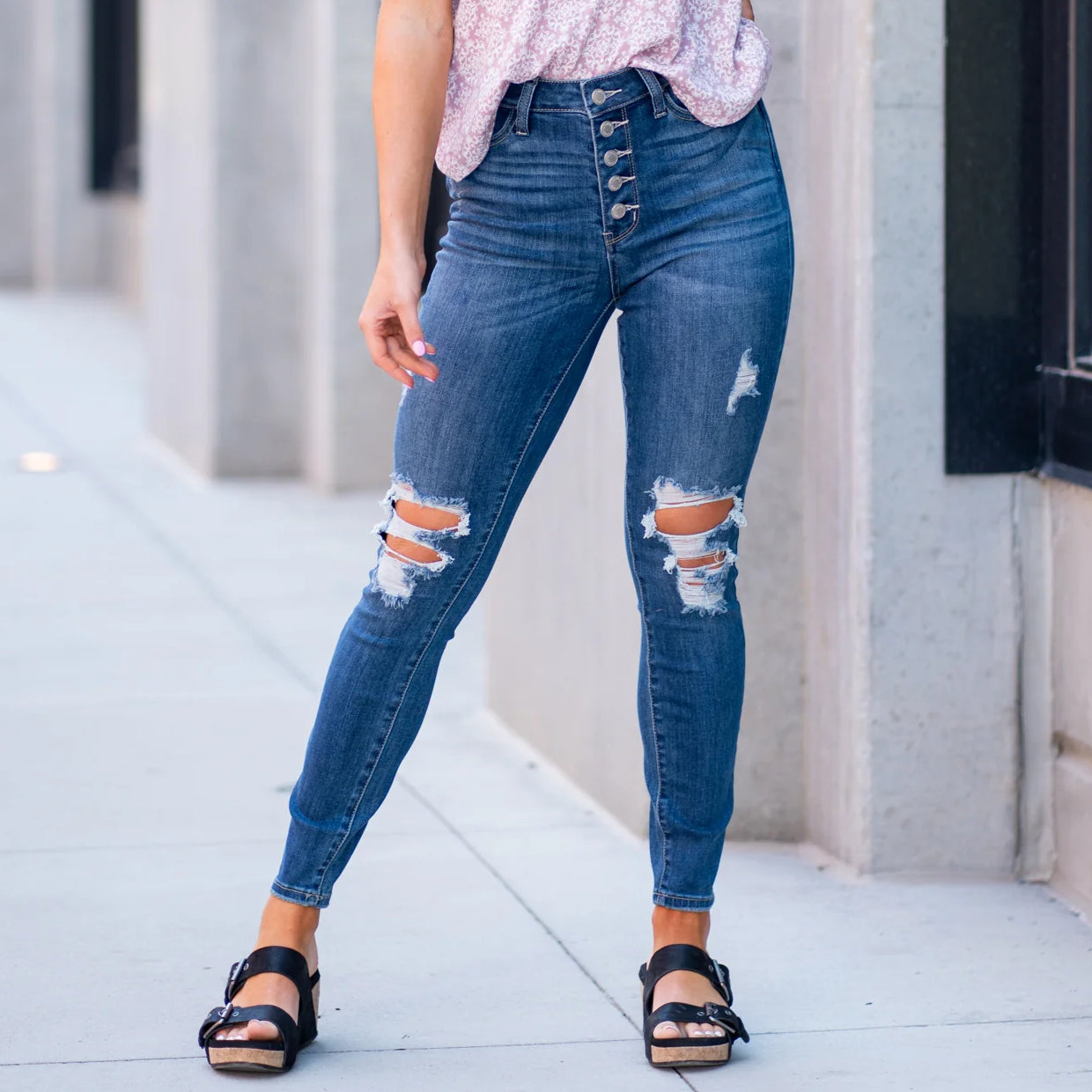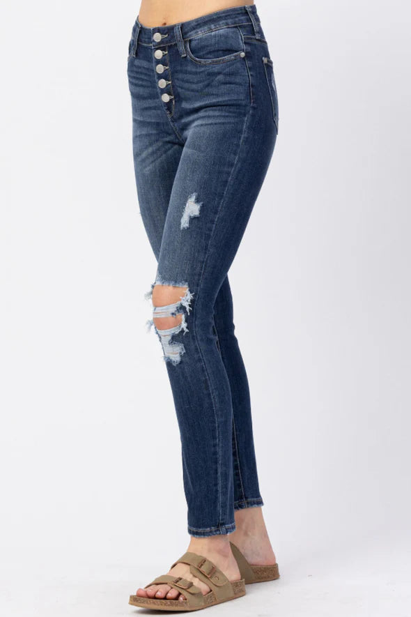 Judy Blue Button Fly Skinny High Waist Jeans (Style: 88477 88477PL). Everyone needs at least one pair of button fly jeans in their collection! These may be my new 'rebel' jeans! These have a soft feel and that classic Judy Blue stretch! A classic dark denim with a 5 pocket design and button fly. Skinny jeans have that very fitted look. Throw these jeans on with your favorite top and shoes for an awesome outfit! These run true to size. Color may vary on your screen.
