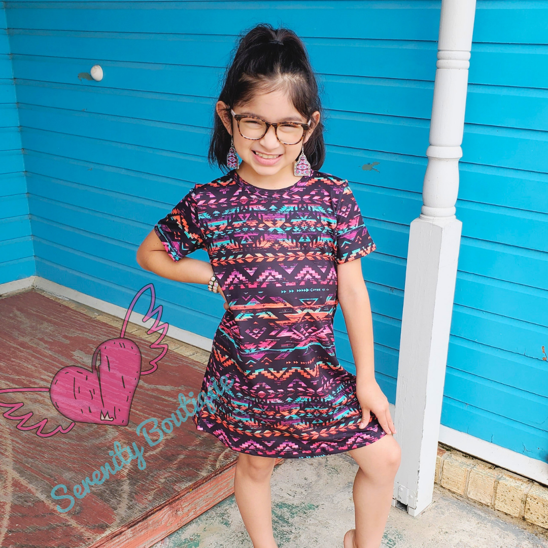 This dress is so fun! This loud pattern is perfect for your child! The material is so soft and comfortable! This dress is true to size!
