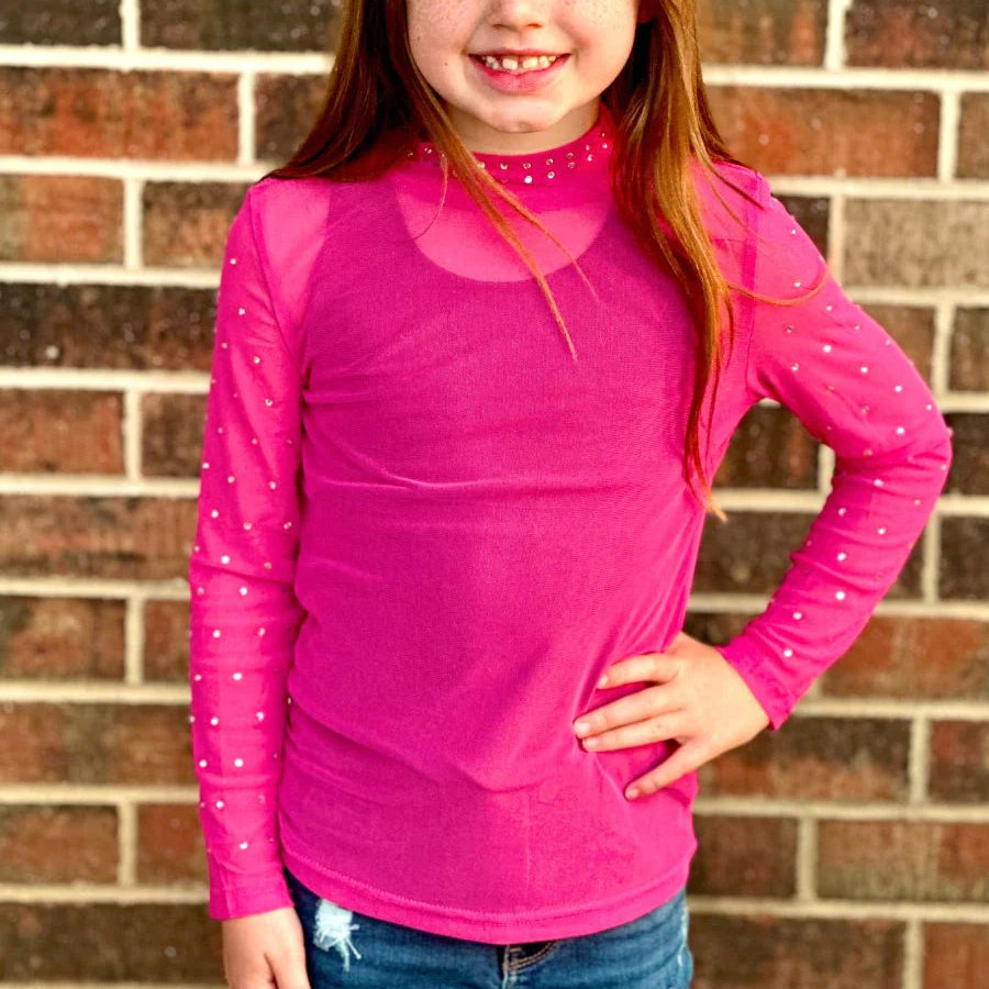 This Only Prettier Top KIDS is soooooo pretty! Let your little princess sparkle and shine in stylish comfort with this candy-colored mesh top. The neckline and arm detail have glimmering rhinestones the whole family will love. It's a style that will take her places!