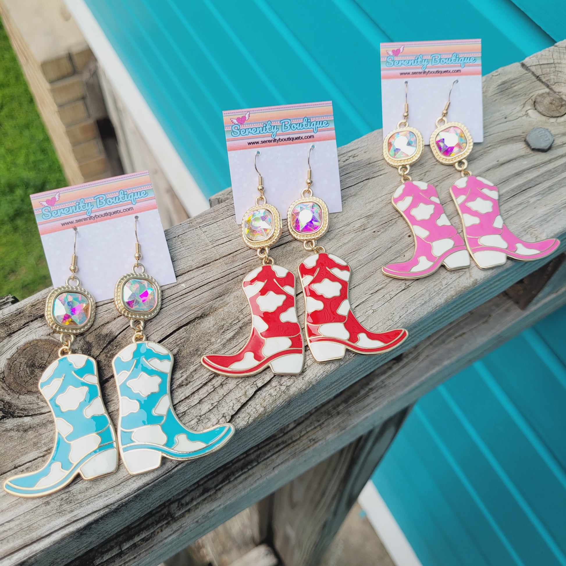 Drop rhinestone accent and cow print cowgirl boots earrings